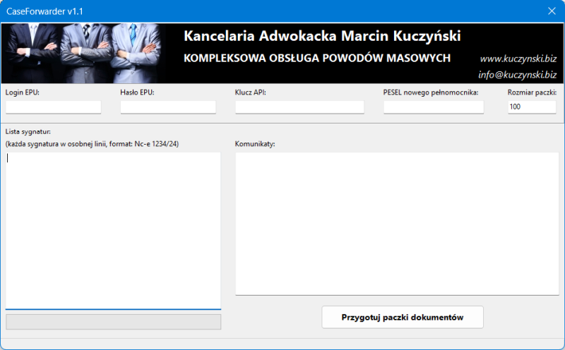 Case Forwarder to aplikacja służąca do zbiorczego przekazywania spraw w EPU (e-sad.gov.pl) nowemu pełnomocnikowi w oparciu o sygnatury akt spraw.