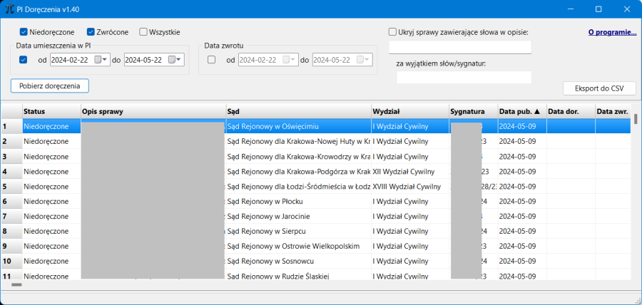 PI Doręczenia to aplikacja służąca do pobierania listy doręczeń z Portalu Informacyjnego, ze wszystkich apelacji do jednej tabeli. Aplikacja jest przydatna, w szczególności pełnomocnikom prowadzącym sprawy w różnych apelacjach.